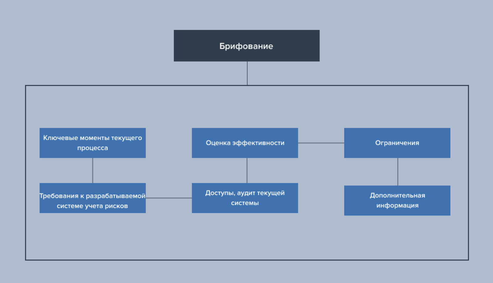 Брифование сотрудников – проведение анкетирования и опроса руководителей подразделений, ответственных лиц за СУР, а также рядовых сотрудников, которые будут взаимодействовать с СУР на предмет описания всех процессов и их этапов, особенностей и обязательных элементов бизнес-процесса.