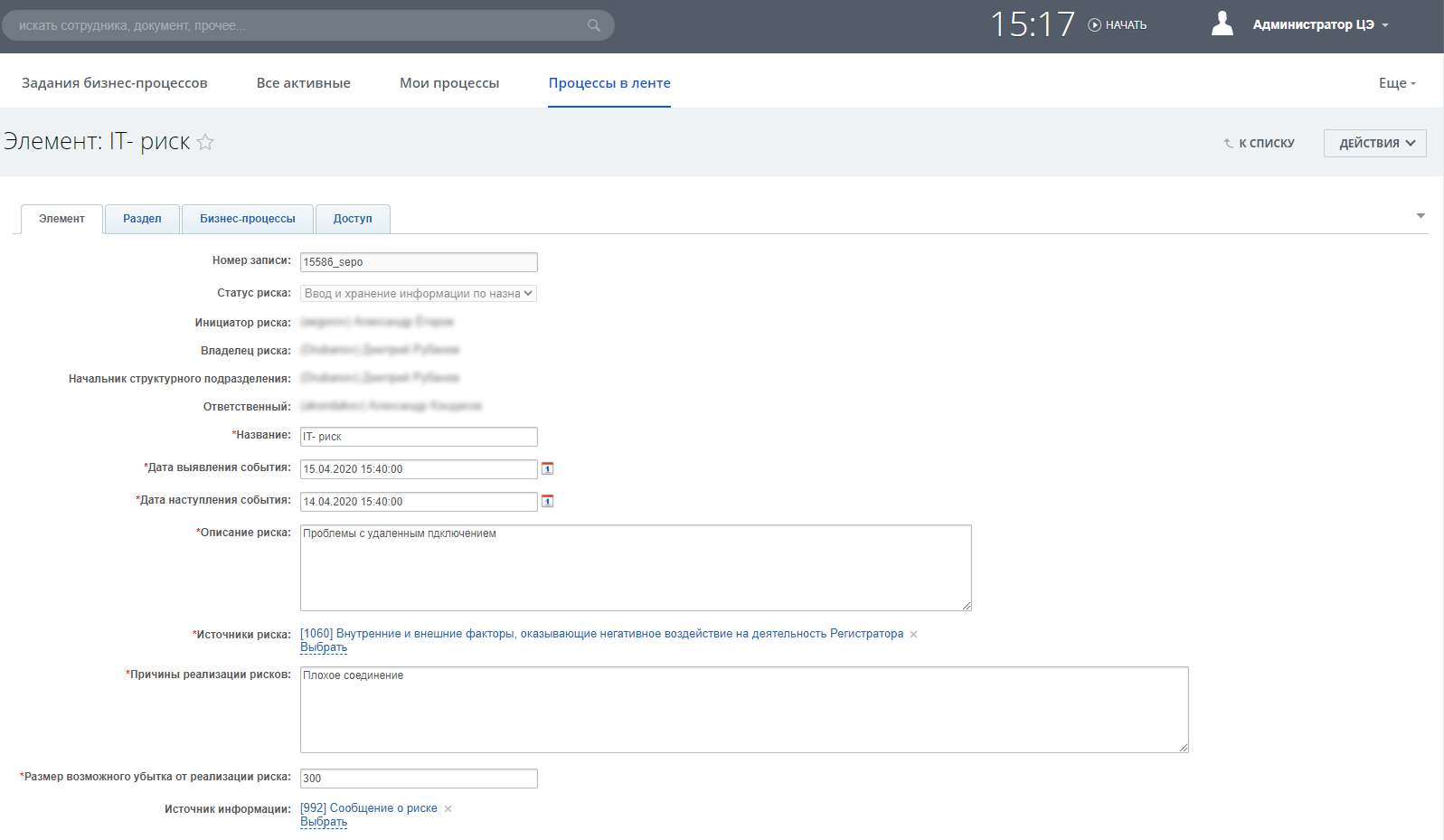 Разработка бизнес-процессов управления рисками на основании технического задания с помощью модуля «Редактор бизнес-процессов» - суть системы управления рисков заключается в том, что любой сотрудник может создать уже наступивший риск, на который необходимо реагировать в кротчайшие сроки, или потенциально возможный - для его устранения. И при этом не нужно искать ответственного сотрудника, кому нужно направить риск и переживать за то, взяли ли его в работу или нет. Это все есть с созданном нами бизнес-процессе СУР. Созданный риск направляется руководителю отдела СУР, который назначает нужного ответственного за конкретный риск, назначает и контролирует ход мероприятий по риску, а также оценивает его издержки. Система учета рисков позволяет сокращать время реагирования на любые имеющиеся и возможные проблемные ситуации, а так же иметь постоянный контроль нерешенных вопросов.