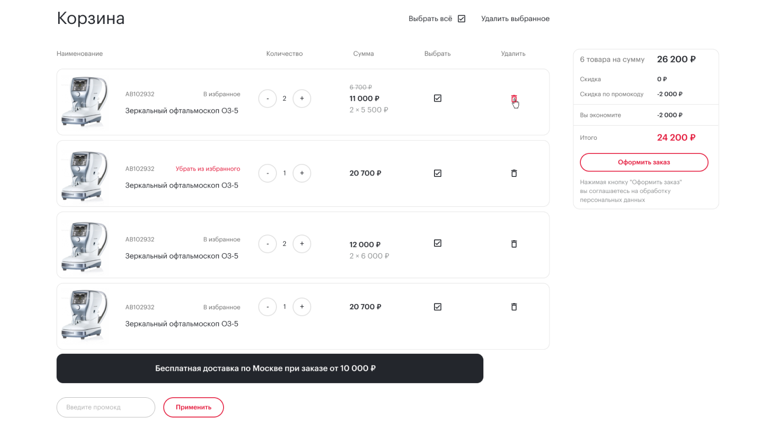 Если у пользователя есть промокод, при вводе его стоимость корзины автоматически пересчитывается.