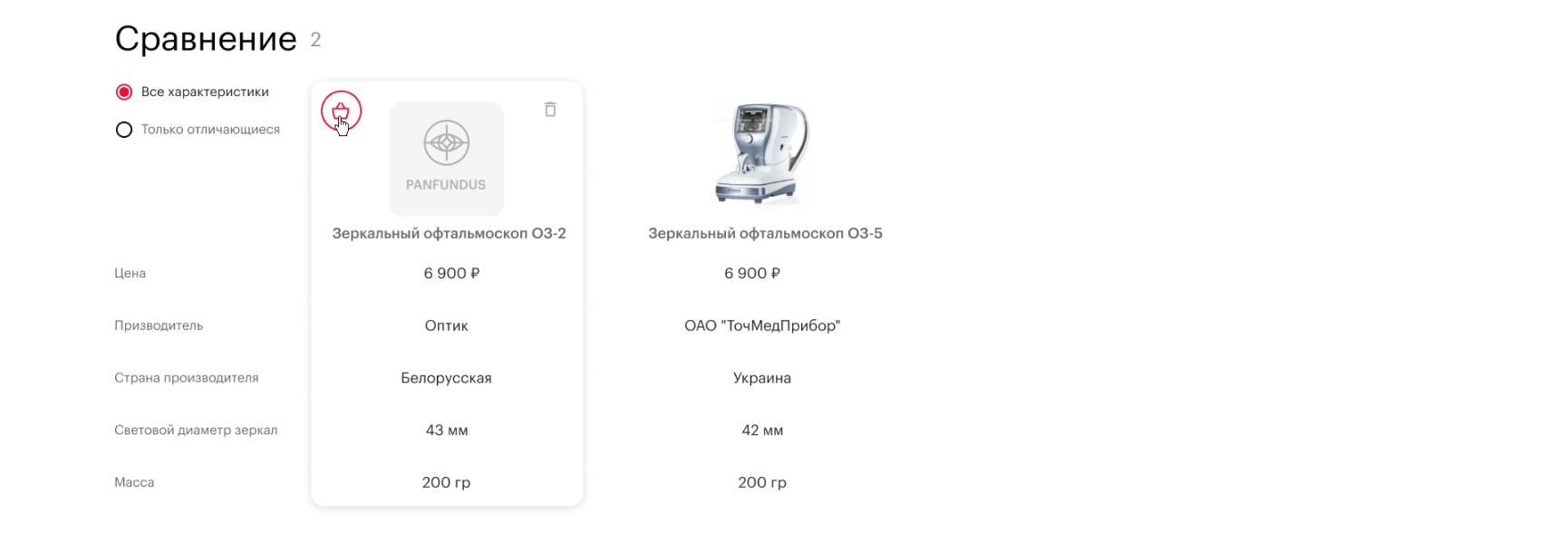 При добавление товаров в сравнение можно увидеть отличительные данные по всем характеристикам товаров.
