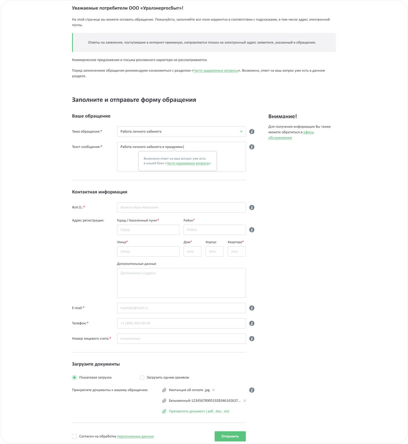 Все обращения разделены на темы, за каждой темой закреплен ответственный сотрудник Уралэнергосбыта. У пользователей есть возможность отправить свое обращение через сайт, не приходя физически в офисы Уралэнергосбыта. Для этого им необходимо выбрать тему обращения и заполнить все необходимые поля в появившейся форме.
