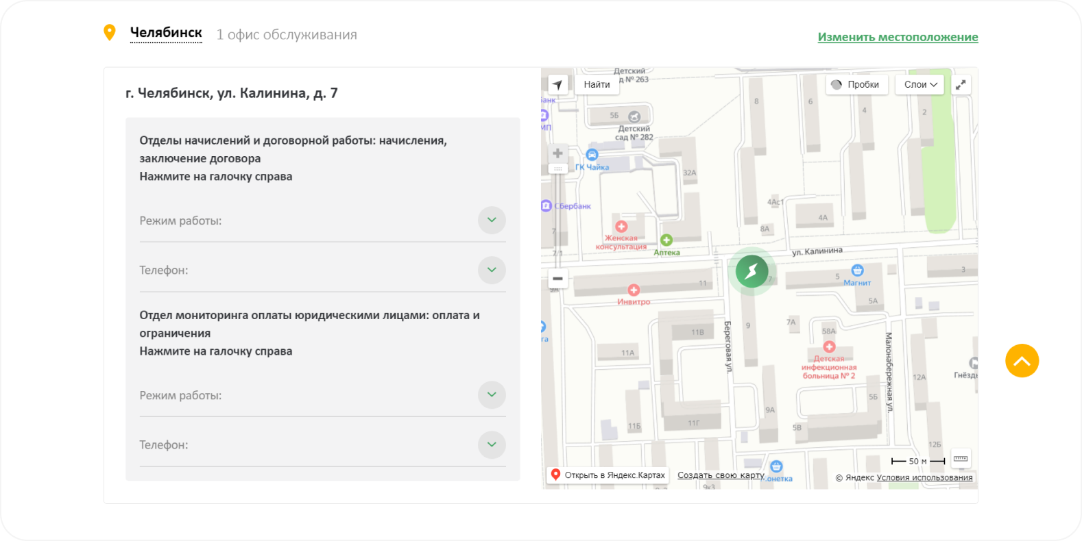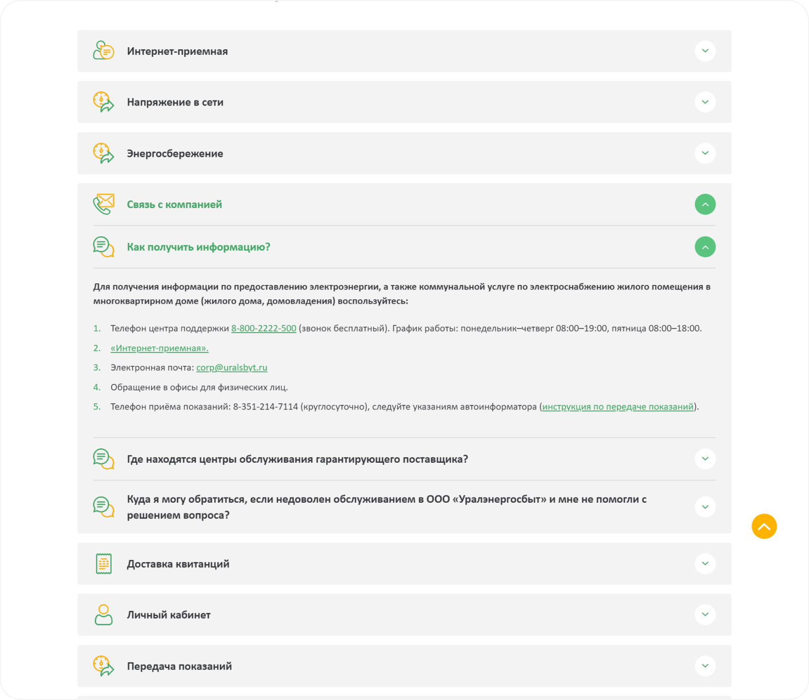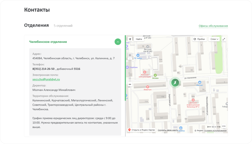 Для бизнеса контакты разделены на Отделение ООО «Уралэнергосбыт» и на Адреса очного обслуживания клиентов.