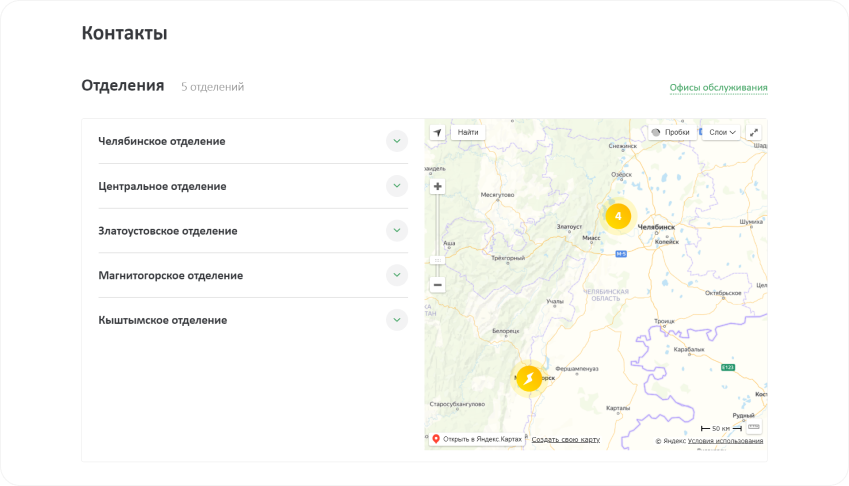 В разделе «Офисы обслуживания» пользователи могут найти офисы обслуживания по своему местоположению и подробную информацию о них: адрес, режим работы, телефон.