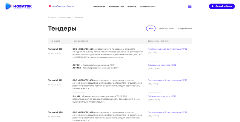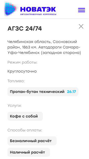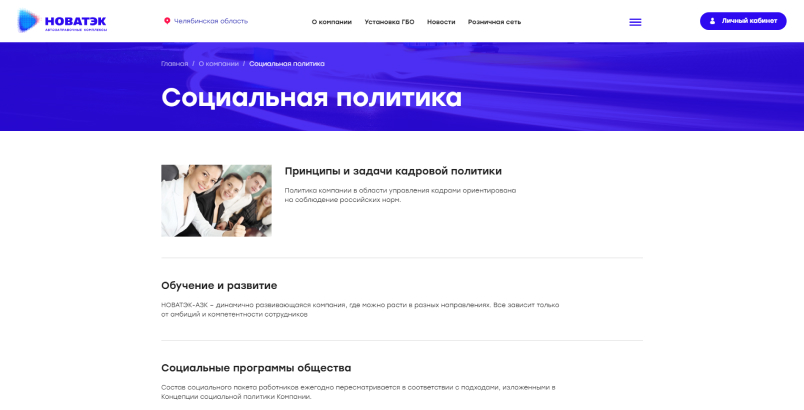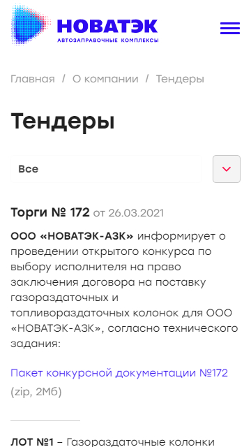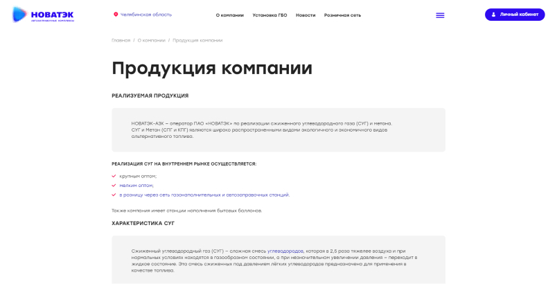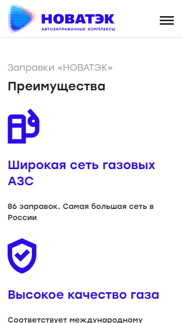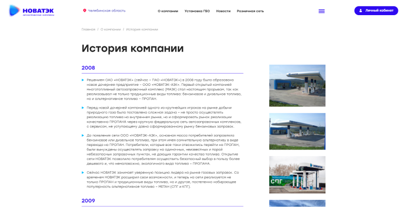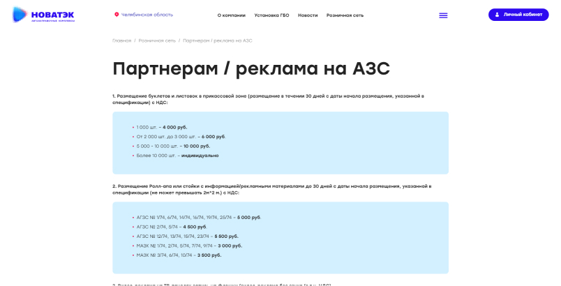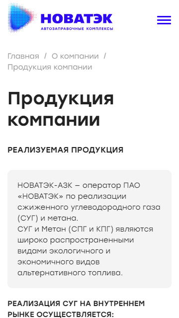 Разработали текстовые страницы для информирования посетителей сайта о различных данных. Так на сайте можно ознакомиться с продукцией, историей компании ООО «НОВАТЭК-АЗС», текущими и проведенными тендерами, социальной политикой компании, аренде и продажи непрофильных активов, возможностью стать партнером или разместить рекламу на АЗС, а также новостями и акциями компании.