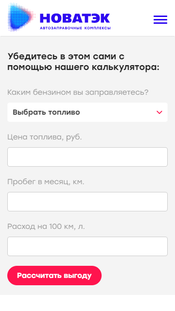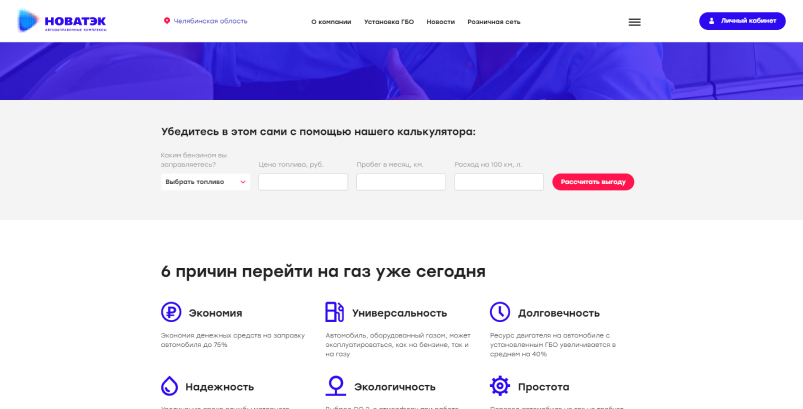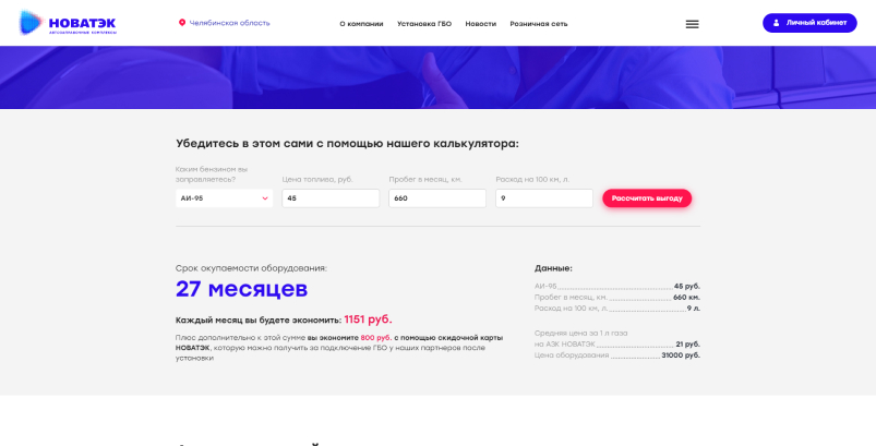 На этой странице мы разработали калькулятор по выгоде перехода с бензина на газ, где пользователю необходимо выбрать топливо, которым сейчас он пользуется, заполнить данные по стоимости топлива, пробегу в месяц и расходу на 100 км. По итогу будет выведен подсчет срока окупаемости оборудования, экономии расхода в месяц, а также сравнительные данные текущих расходов пользователя и стоимости 1 л газа на заправке АЗК НОВАТЭК.