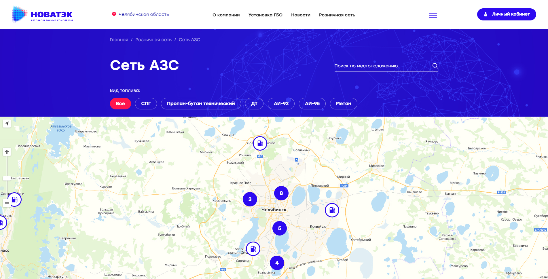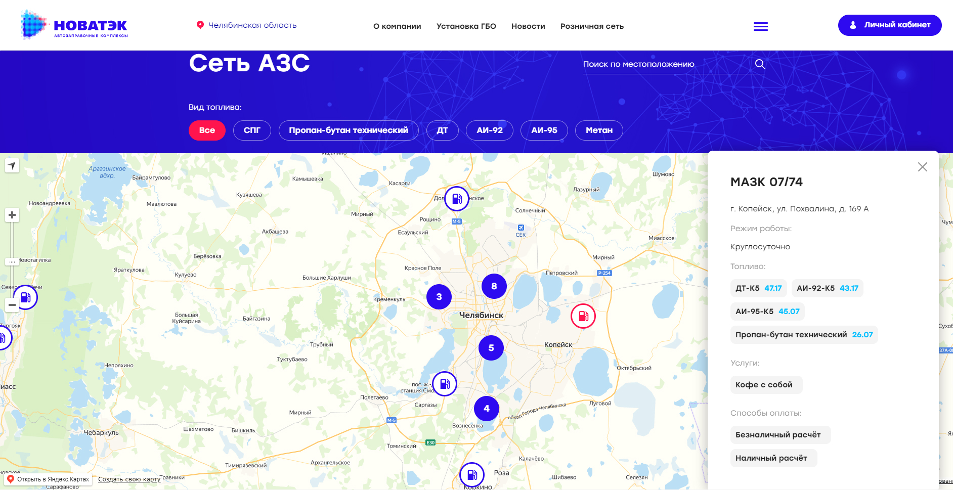 На странице Сети АЗС пользователь может по выбранному местоположению увидеть на карте точки заправочных станций, причем можно отсортировать станции по виду топлива. При нажатии на конкретную станцию будет предоставлена информация: наименование станции, адрес, режим работы, виды топлива, дополнительные услуги и способы оплаты. Все данные приходят из Базы данных Oracle.