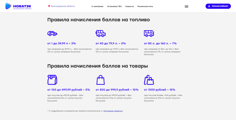 На сайте представлены страницы с бонусными картами и программами лояльности. Пользователям расписаны выгоды программ, преимущества и правил начисления баллов на топливо и на товары.