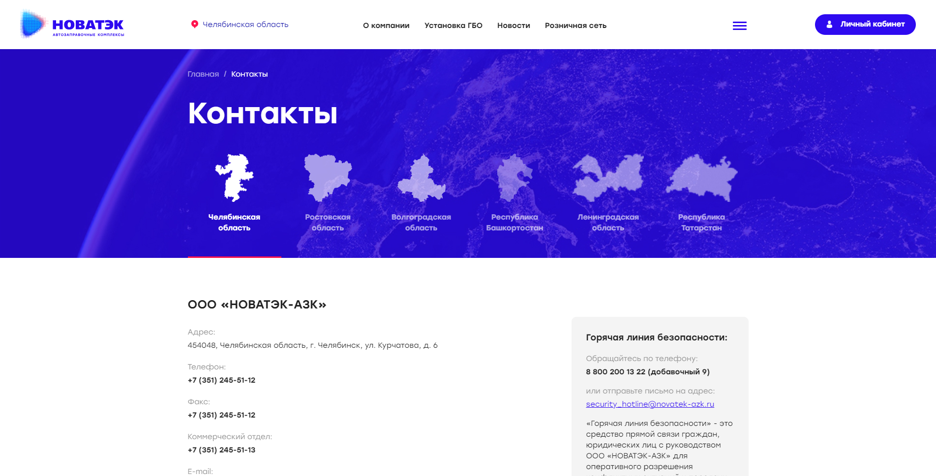 На странице контактов пользователь видит контактные данные филиалов по областям, телефон горячей линии и возможность задать вопрос через форму обратной связи.